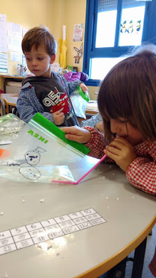 Las bolitas han salido muy pequeñas y se nos colaban por la pajita, así que para evitar que se las tragen, hemos visto un poco cómo nieva y lo hemos dejado en clase, a ver si consigo bolitas más grandes y que no se puedan colar por la pajita.