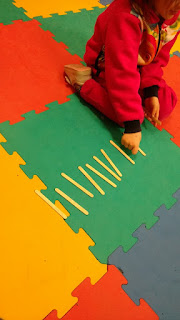 En la alfombra siempre tenemos 10 palitos, nos tapamos los ojos y desaparecen algunos de estos palitos. El niño cuenta cuántos palitos han quedado en la alfombra y tienen que decir cuántos palitos le he quitado. Cuando dicen el número de palitos que ha desaparecido se los devuelvo y comprueban que está bien hecho.